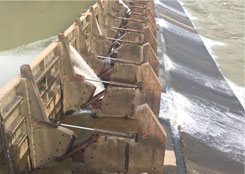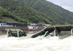 翻板壩阻水,經不住洪水的沖擊,易被漂浮物卡塞或上游淤積造成不能自動翻板,容易被洪水沖壞壩體影響防洪安全。洪水過后翻板門再關上時被異物卡住,造成大量漏水,一旦淤積厚度較大或泥沙板結,閘門就不能正常回門(眾多閘門中只要有一扇),將影響河道正常蓄水。汛期漂浮物(特別是樹枝)經??ㄗ¢l門導致起翻或回落困難,威脅到行洪安全。